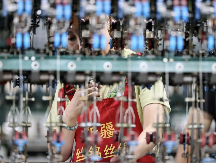 2025年7月29日,工人在新疆絲錦絲綢紡織有限公司生產(chǎn)車間內(nèi)的自動(dòng)繅絲機(jī)上作業(yè)。近年來(lái),新疆塔城地區(qū)烏蘇市引進(jìn)桑蠶繭絲綢智能化全產(chǎn)業(yè)鏈項(xiàng)目,鼓勵(lì)農(nóng)民種桑養(yǎng)蠶,拓寬興邊富民新“絲”路。