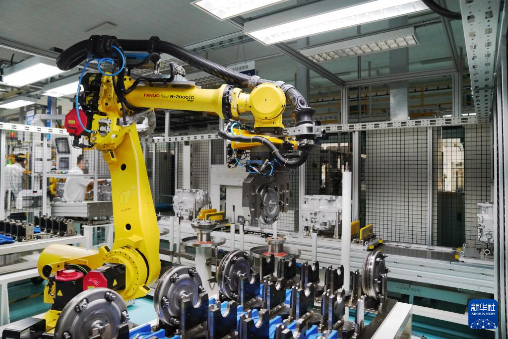 在哈爾濱東安汽車動力股份有限公司生產(chǎn)車間,工業(yè)機器人在生產(chǎn)作業(yè)(7月24日攝)。