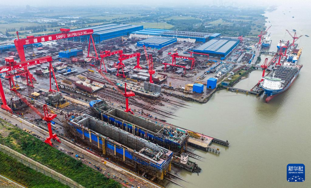 10月14日,在位于江蘇省泰州市高港區(qū)的泰州三福船舶工程有限公司生產(chǎn)基地,多艘大型船舶正在建造中(無(wú)人機(jī)照片)。新華社發(fā)(周社根攝)