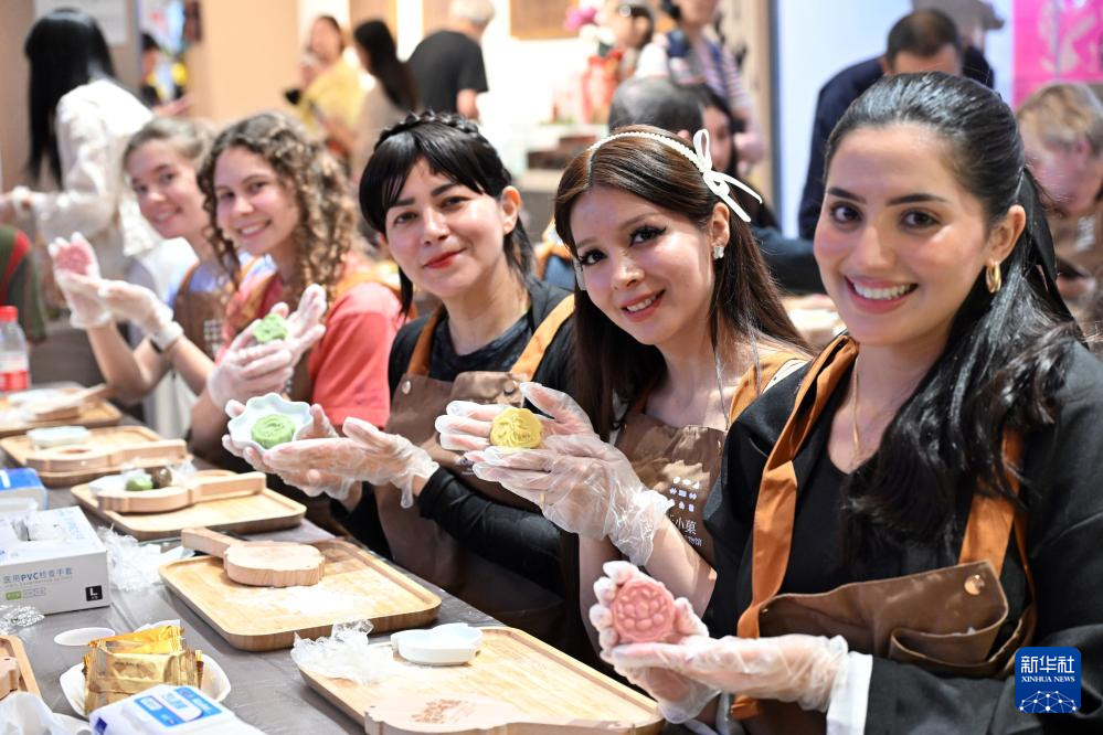 9月29日,在北京市朝陽區(qū)于小菓點心模具博物館,中外青年展示自己制作的月餅。