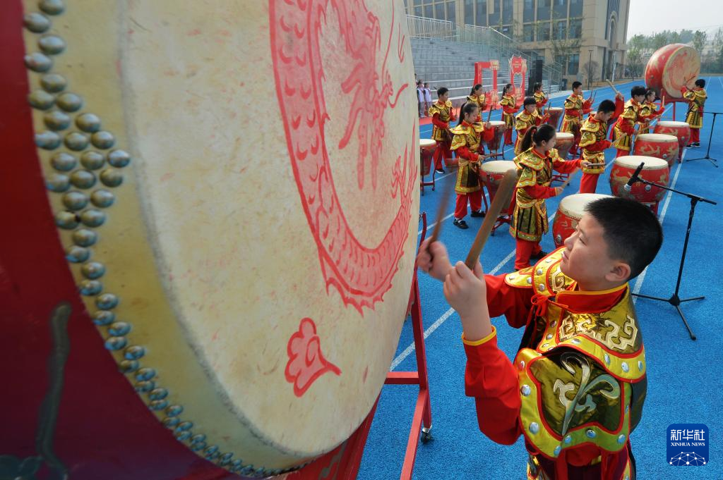 9月29日,在山東青島啟潤實驗學(xué)校舉行的迎國慶主題活動中,學(xué)生表演鼓舞。