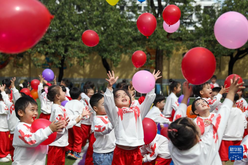 9月29日,河南省平頂山市寶豐縣鬧店鎮(zhèn)中心幼兒園的孩子們在放飛氣球。