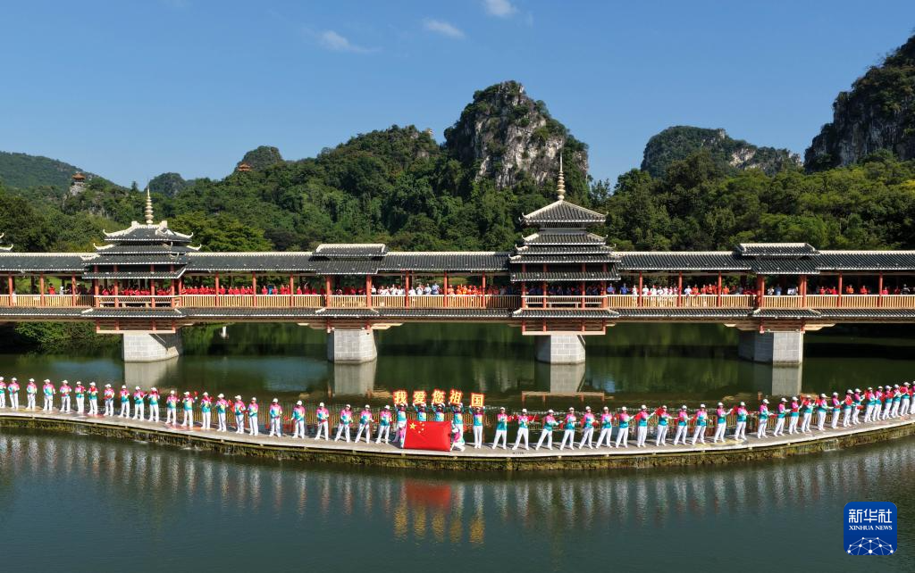 9月28日,在廣西柳州市龍?zhí)豆珗@,人們共同唱響《我和我的祖國》(無人機照片)。