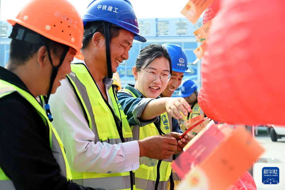 9月29日,工友們在中鐵建工青島火車北站東廣場項目部迎國慶班組主題活動上猜燈謎。