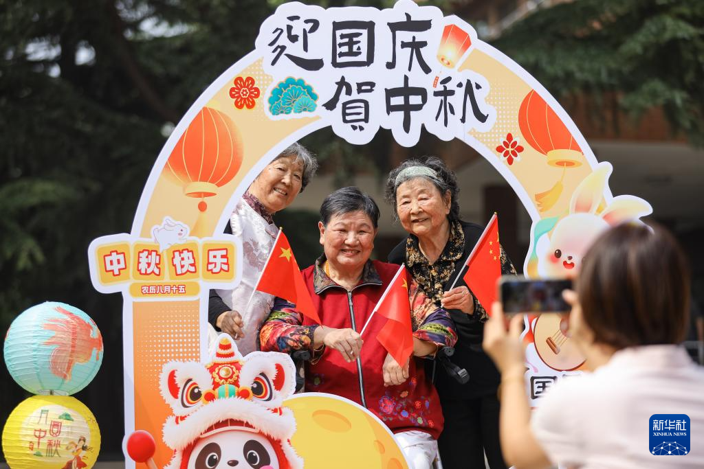 9月29日,在山東省青島市李滄區(qū)頤福養(yǎng)老院,工作人員在“喜迎國慶 月滿中秋”主題活動上為老人們拍照。