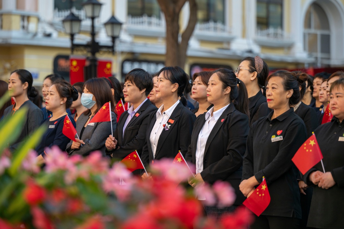 10月1日,人們在哈爾濱市道里區(qū)中央大街參加升旗儀式。