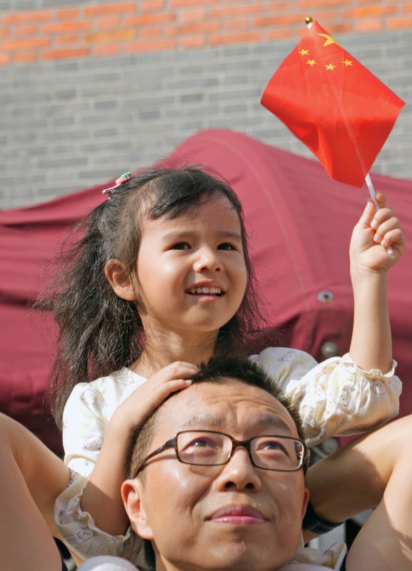 10月1日,在上海中共一大紀念館,一名小女孩坐在爸爸的肩膀上觀看升旗。