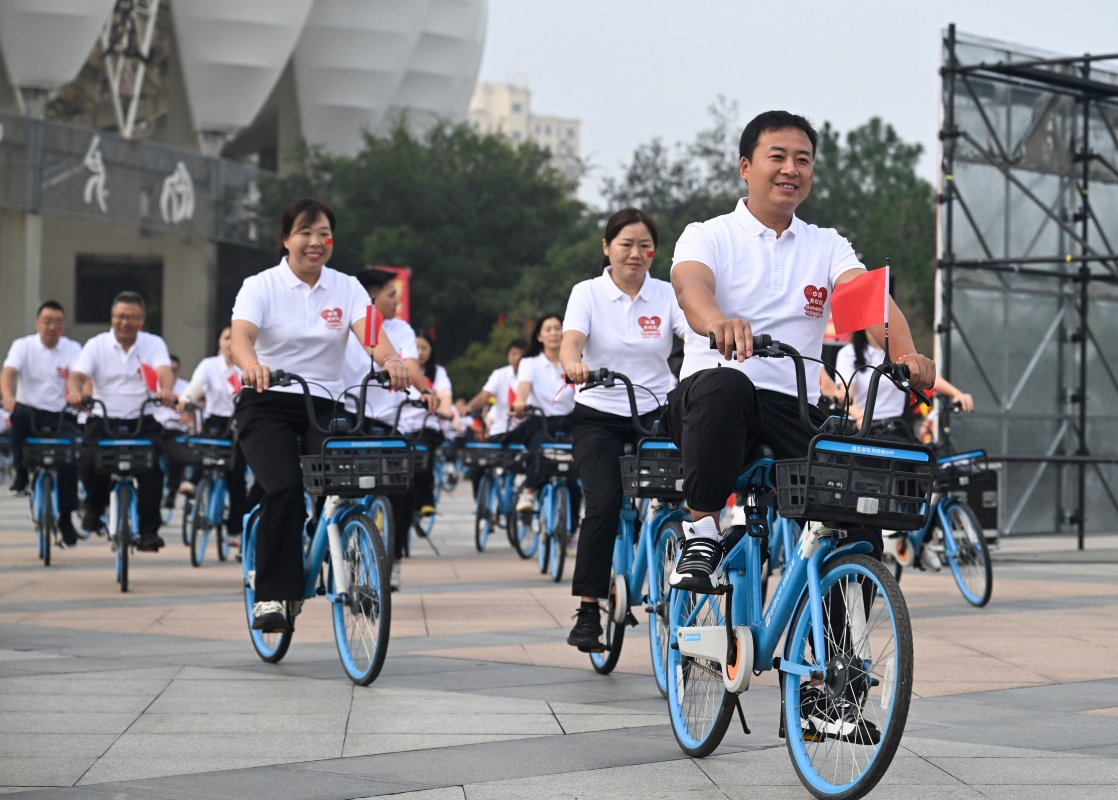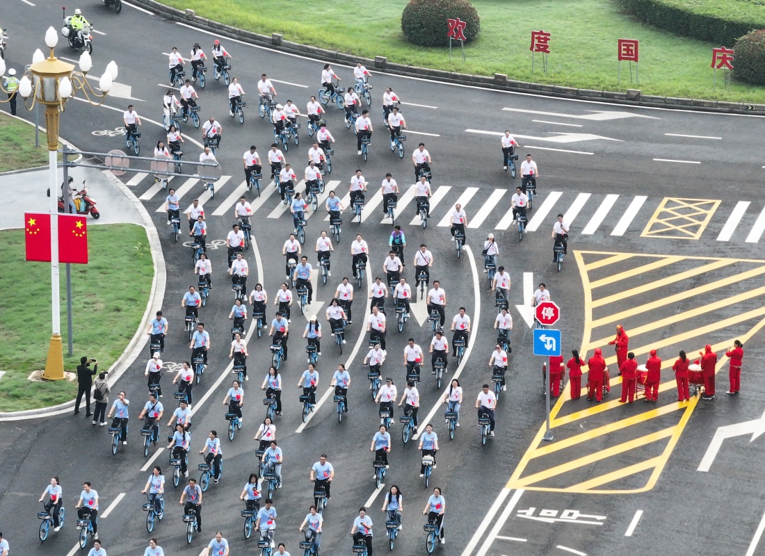 10月1日,江蘇省淮安市盱眙縣舉行“共賀祖國華誕”綠色騎行活動,參與者騎車出發(fā)。