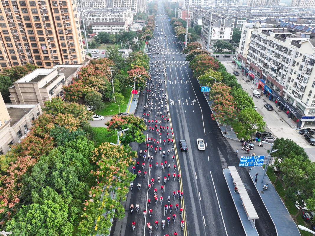10月1日,江蘇省淮安市盱眙縣舉行“共賀祖國華誕”綠色騎行活動(無人機照片)。