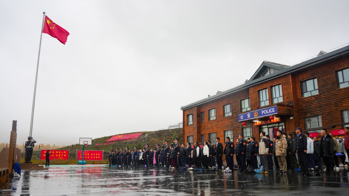 10月1日在新疆阿勒泰邊境管理支隊喀納斯邊境派出所拍攝的升旗儀式。