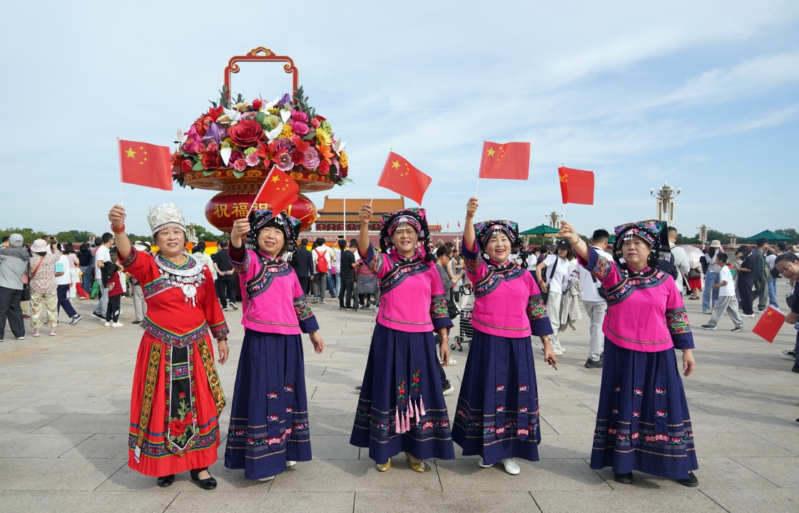 10月1日,來自貴州的布依族游客在北京天安門廣場游覽拍照。