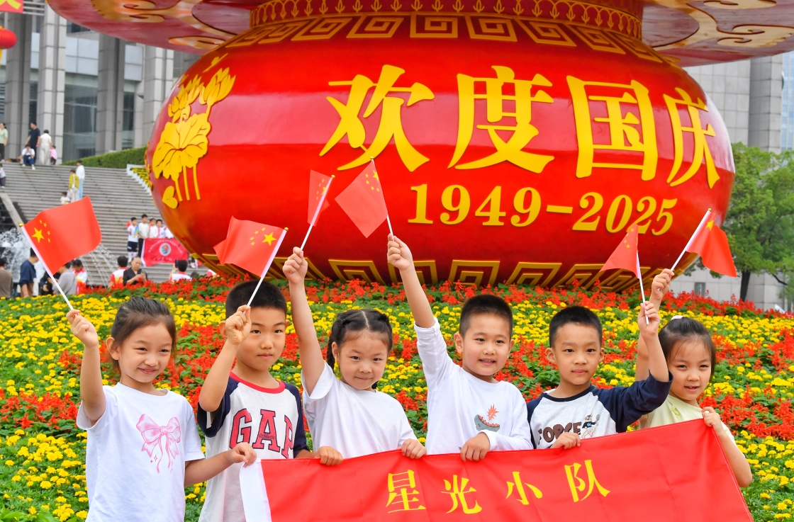 10月1日,小朋友在安徽省合肥市蜀山區(qū)市民廣場國慶主題花籃前拍照。