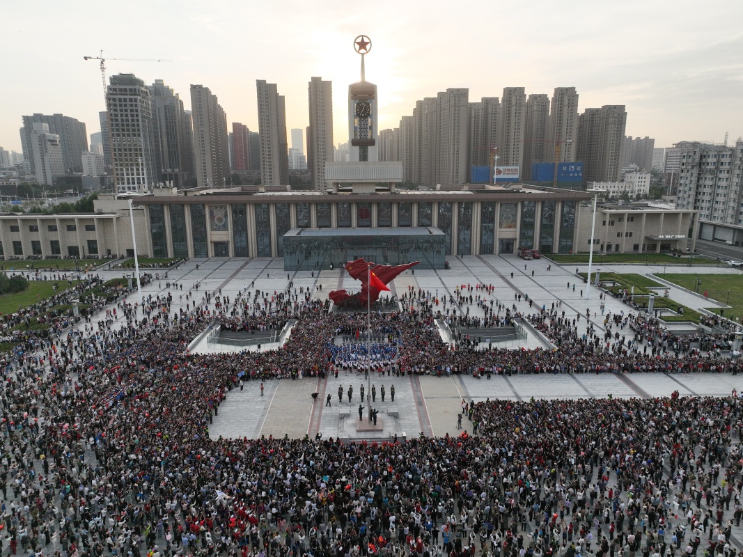 10月1日,人們在河北省石家莊解放廣場參加升旗儀式(無人機照片)。