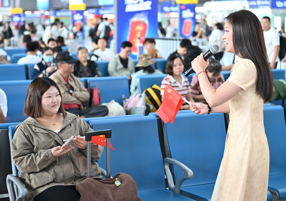 10月1日,鐵路天津站在候車廳開展歌唱祖國音樂快閃活動。這是天津音樂學(xué)院的學(xué)生為旅客演唱歌曲。
