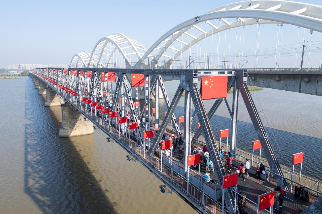 10月1日,游客在哈爾濱市濱州鐵路橋上游覽(無人機照片)。
