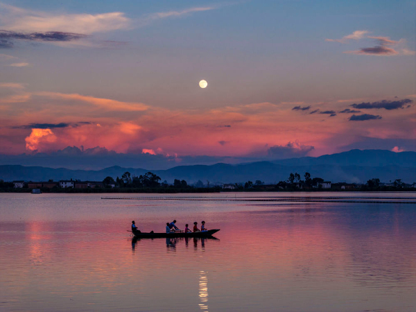 10月6日,人們乘船在云南大理洱源西湖賞月(無人機(jī)照片)。新華社發(fā)(羅新才攝)