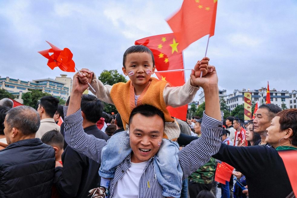 10月1日,一對(duì)父子在云南省曲靖市麒麟?yún)^(qū)南城門廣場(chǎng)觀看升旗。 新華社發(fā)(孫文來(lái)攝)
