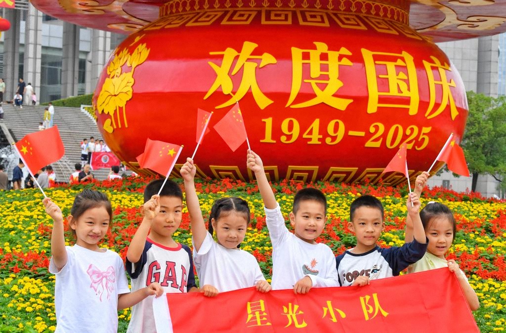 10月1日,小朋友在安徽省合肥市蜀山區(qū)市民廣場(chǎng)國(guó)慶主題花籃前拍照。新華社發(fā)(陳三虎攝)