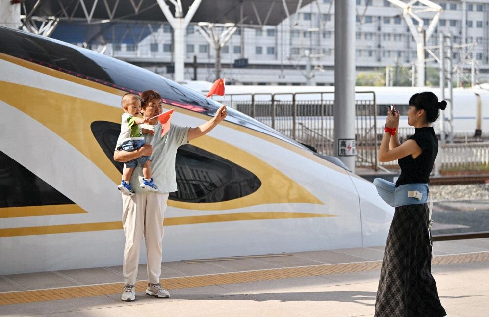 10月1日,旅客在天津站城際列車旁留影。新華社記者 李然 攝