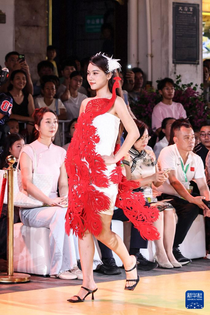 10月7日晚,作為2025海口藝術(shù)周系列活動之一,錦色·2025非遺潮秀在??隍T樓老街啟幕?;顒右浴胺沁z再創(chuàng)”為核心,將剪紙藝術(shù)元素融入時裝走秀。新華社記者 張麗蕓 攝