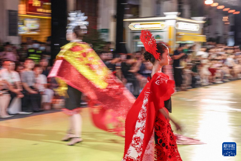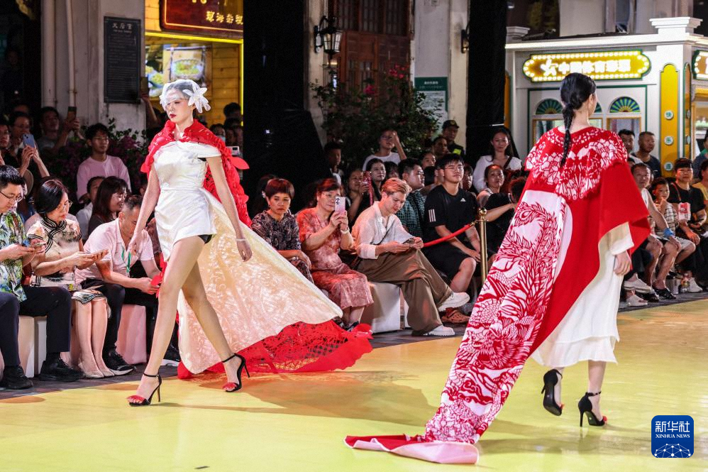 10月7日,身穿剪紙主題時裝的模特在??隍T樓老街走秀。新華社記者 張麗蕓 攝