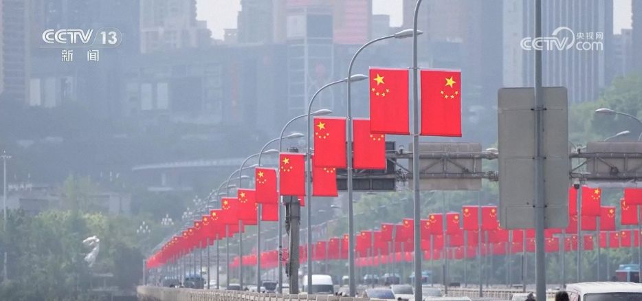 在重慶渝中區(qū),當?shù)卦陂L江大橋等20條重要路段以及城市交通要道、旅游景點周邊的道路燈桿上懸掛了4000余面五星紅旗,將城市妝點得格外喜慶。
