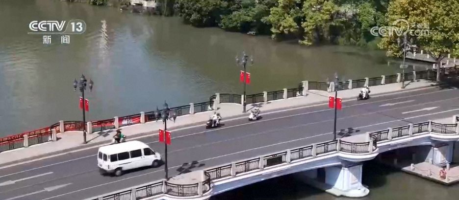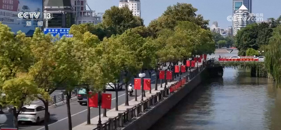 同樣,這幾天,江蘇多地也在打造濃濃的節(jié)日氛圍。在南通濠河邊,鮮艷的國旗像一簇簇跳動的火焰,與濠河的粼粼波光、兩岸的綠樹蔥蘢交相輝映,構成了一幅流動的中國紅畫卷。