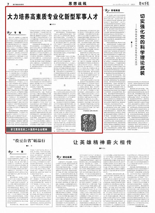 強軍興軍,關(guān)鍵靠人才,基礎(chǔ)在教育。黨的十八大以來,習主席站在黨、國家和軍隊事業(yè)全局的戰(zhàn)略高度,始終把院校教育和人才培養(yǎng)擺在強軍興軍的優(yōu)先發(fā)展位置,推動我軍人才工作取得歷史性成就、發(fā)生歷史性變革。在黨的二十屆四中全會上,習主席強調(diào),“統(tǒng)籌教育強國、科技強國、人才強國建設”“推進政治建軍、改革強軍、科技強軍、人才強軍、依法治軍”。新征程上,我們必須學習好貫徹好黨的二十屆四中全會精神,深入實施新時代人才強軍戰(zhàn)略,大力培養(yǎng)高素質(zhì)專業(yè)化新型軍事人才,為強軍事業(yè)提供堅強有力的人才支撐。
