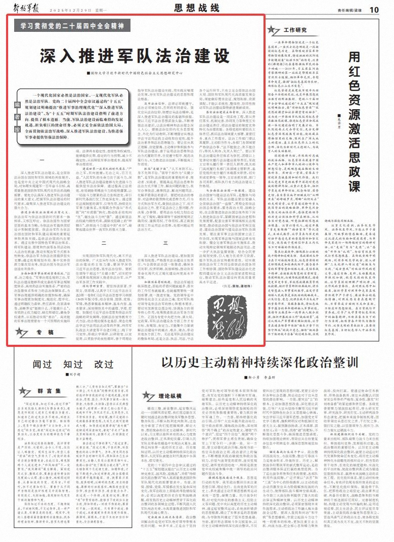 深化學(xué)研宣貫。要堅(jiān)持讀原著、學(xué)原文、悟原理,認(rèn)真學(xué)習(xí)《習(xí)近平法治文選》第一卷和《習(xí)近平法治思想學(xué)習(xí)綱要(2025年版)》等,結(jié)合世情、國(guó)情、黨情、軍情,熟悉掌握基本精神、基本內(nèi)容、基本要求,深刻領(lǐng)悟其中的道理、學(xué)理、哲理。加強(qiáng)對(duì)習(xí)近平法治思想和依法治軍戰(zhàn)略的研究闡釋?zhuān)瑒?chuàng)新法治宣傳教育方式方法,結(jié)合理論服務(wù)走基層、常態(tài)化尊法學(xué)法守法用法活動(dòng)等的開(kāi)展,利用軍隊(duì)政法大講堂等平臺(tái)進(jìn)行線上、線下學(xué)習(xí)宣傳,形成以學(xué)領(lǐng)研、以研助宣、以宣促貫、以貫驗(yàn)學(xué)的良性循環(huán),善于用理論指導(dǎo)軍隊(duì)法治建設(shè)實(shí)踐、用實(shí)踐反哺理論發(fā)展,夯實(shí)軍隊(duì)法治建設(shè)的思想和理論根基。