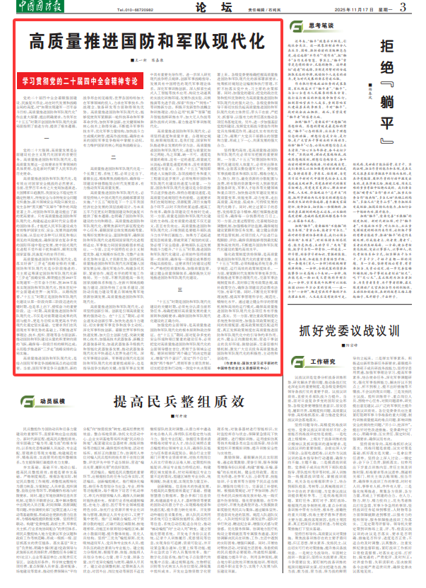 高質(zhì)量推進(jìn)國防和軍隊(duì)現(xiàn)代化是一個(gè)長期工程、系統(tǒng)工程,必須立足當(dāng)下、著眼長遠(yuǎn),精準(zhǔn)聚焦戰(zhàn)略指向,確保每一項(xiàng)建設(shè)舉措都能契合時(shí)代發(fā)展需求,有力推動(dòng)我軍高質(zhì)量發(fā)展。