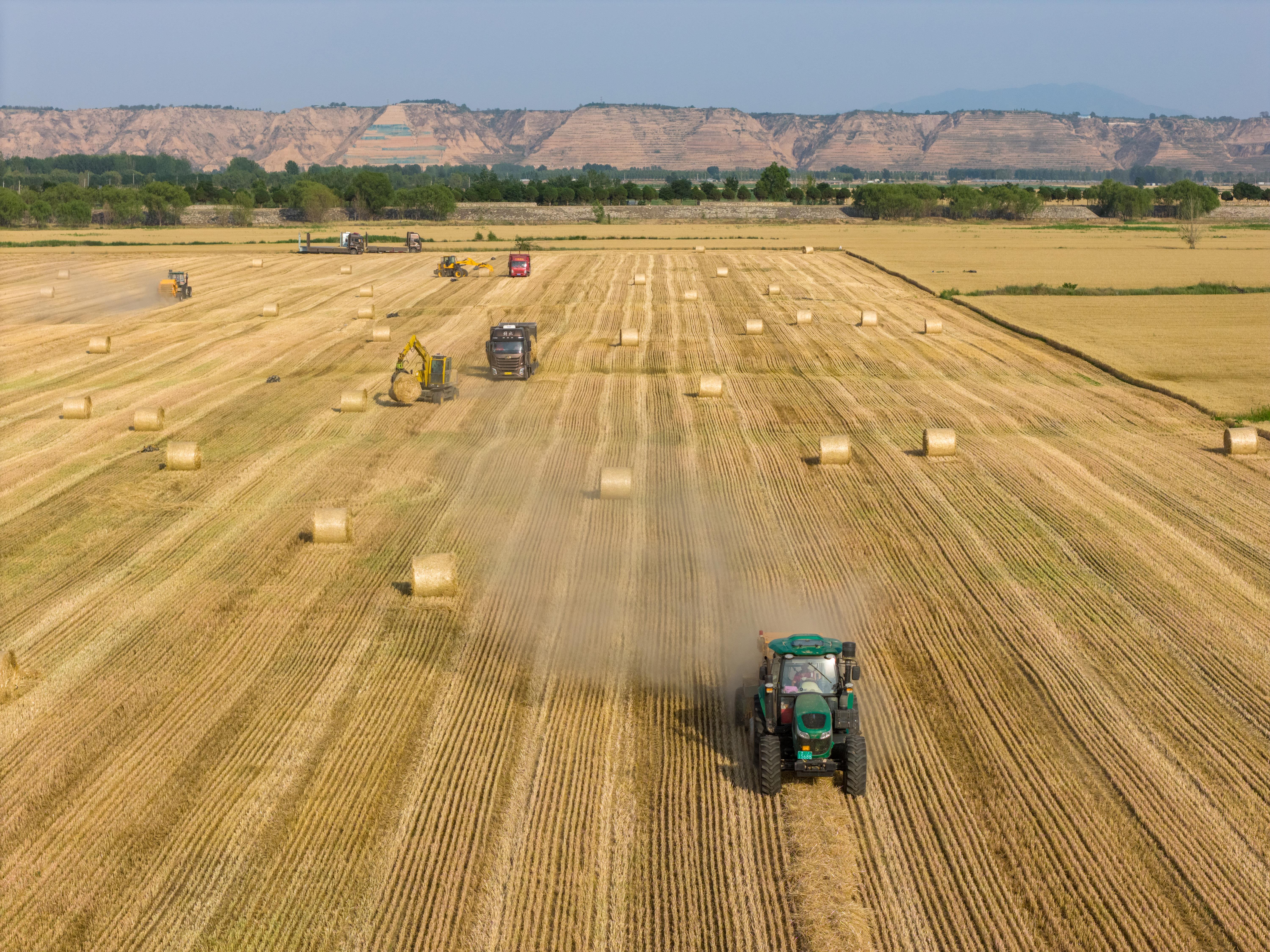 據(jù)國家統(tǒng)計(jì)局發(fā)布的數(shù)據(jù),2025年全國夏糧總產(chǎn)量14973.8萬噸,實(shí)現(xiàn)穩(wěn)產(chǎn)豐收。圖為今年6月,山西運(yùn)城裴莊鎮(zhèn)黃河灘涂上,農(nóng)機(jī)手忙著實(shí)施小麥秸稈打捆和裝車運(yùn)輸作業(yè)。