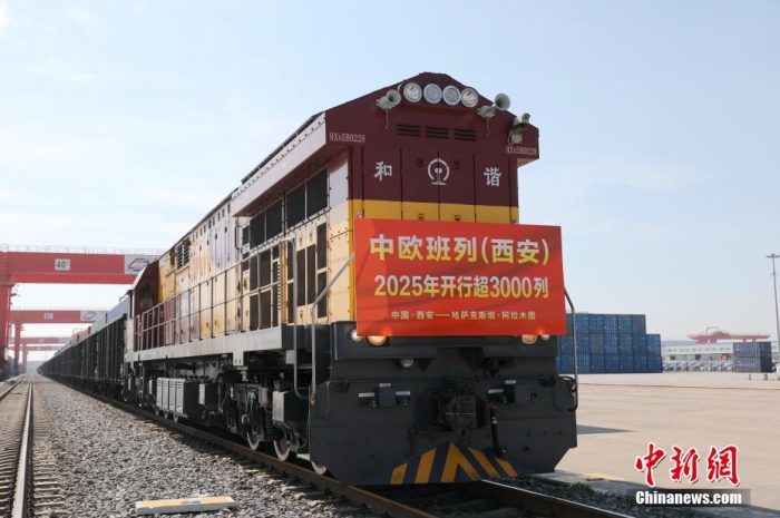 7月4日,滿載日用百貨、陶瓷制品等貨品的中歐班列從西安駛向阿拉木圖。 中新社記者 張遠(yuǎn) 攝