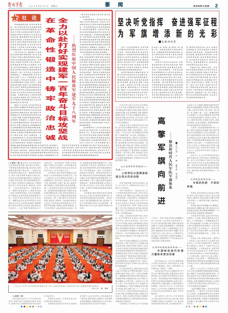 軍旗獵獵迎風(fēng)展,強(qiáng)軍征程勇向前。在以中國式現(xiàn)代化全面推進(jìn)強(qiáng)國建設(shè)、民族復(fù)興偉業(yè)的關(guān)鍵時(shí)期,我們迎來了中國人民解放軍建軍98周年?;仡櫾谥袊伯a(chǎn)黨領(lǐng)導(dǎo)下人民軍隊(duì)的光輝歷程,展望國防和軍隊(duì)現(xiàn)代化建設(shè)的光明前景,全軍官兵堅(jiān)定信心、團(tuán)結(jié)奮斗,在浴火鍛造中更加堅(jiān)強(qiáng),在擔(dān)當(dāng)使命中銳意進(jìn)取,全力以赴打好實(shí)現(xiàn)建軍一百年奮斗目標(biāo)攻堅(jiān)戰(zhàn),向著全面建成世界一流軍隊(duì)砥礪奮進(jìn)。
