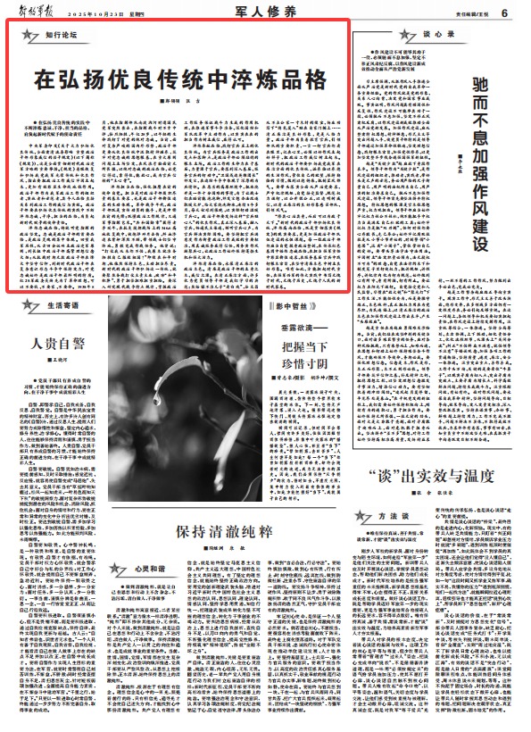 “修其心治其身,而后可以為政于天下?!毙聲r代的政治干部弘揚優(yōu)良傳統(tǒng)、淬煉高尚品格,既是貫徹落實《規(guī)定》的現(xiàn)實要求,更是加強政治干部隊伍建設的永恒課題。每一位政治干部都應當自覺投身政治整訓,在傳承紅色基因中錘煉忠誠品格,在擔當強軍重任中彰顯價值追求,在服務基層官兵中踐行根本宗旨,在堅守清廉本色中樹立良好形象。唯有如此,方能擔起時代重任,在強軍興軍的偉大實踐中書寫無愧于時代、無愧于歷史、無愧于人民的新時代答卷。