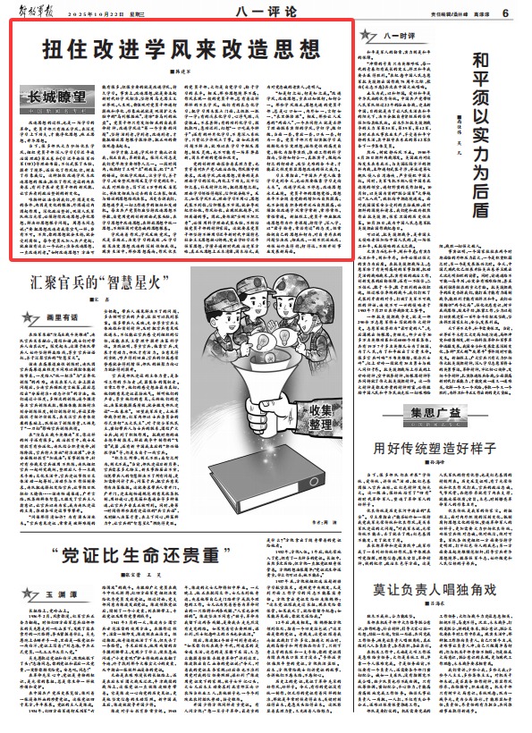 當(dāng)下,很多部隊(duì)大力弘揚(yáng)優(yōu)良學(xué)風(fēng),組織黨員干部深入學(xué)習(xí)《習(xí)近平談治國理政》第五卷和《習(xí)近平論強(qiáng)軍興軍(四)》等理論書籍,不僅武裝了頭腦、提升了境界,還強(qiáng)化了作風(fēng)紀(jì)律、樹立了形象威信。這種扭住改進(jìn)學(xué)風(fēng)來改造思想的做法,抓住了作風(fēng)建設(shè)的內(nèi)在要求,有利于展示黨員干部的新風(fēng)貌,讓官兵看到政治整訓(xùn)的新變化。