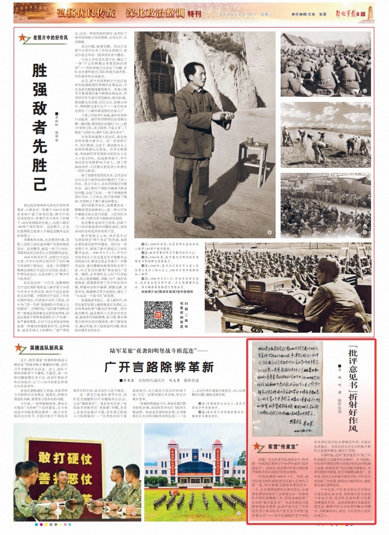 武警廣州支隊(duì)某中隊(duì)榮譽(yù)室中,陳列著一封紙質(zhì)泛黃的寫于60多年前的“批評(píng)意見(jiàn)書”。這封信,見(jiàn)證著中隊(duì)黨支部注重開展批評(píng)和自我批評(píng)的優(yōu)良傳統(tǒng)。