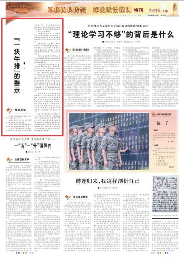 當(dāng)前,我們黨面臨的“四大考驗(yàn)”和“四種危險(xiǎn)”更加復(fù)雜嚴(yán)峻,黨員思想改造的任務(wù)比以往任何時(shí)候都更加緊迫。今年以來(lái),全軍開(kāi)展集中政治整訓(xùn),這告訴我們,越是進(jìn)行偉大斗爭(zhēng),越要堅(jiān)持改造思想,越要鑄牢政治忠誠(chéng)、永葆純潔光榮。每一名黨員、每一名軍人,都應(yīng)該始終牢記蔡孝乾“一塊牛排”的慘痛教訓(xùn)與深刻警示。